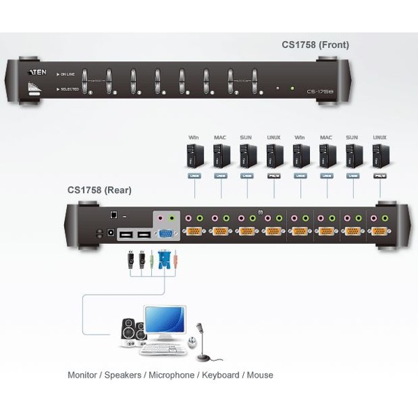 Mit einem CS1758 können Sie bis zu 8 Computer von einer Konsole aus steuern. Der KVM-Switch unterstützt neben USB-, PS/2- und Videosignalen auch Audiosignale. Durch Reihenschaltung von weiteren 73 Geräten, auf maximal 3 Ebenen, lassen sich bis zu 512 Computer von der ursprünglichen Konsole aus steuern und verwalten. Der CS1758 ist eine zuverlässige, sichere und zukunftsorientierte Lösung die gemeinsam mit der Firma wachsen kann.