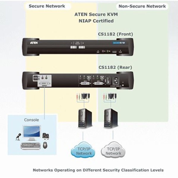 Der CS1182 ist ein Over IP Steuergerät mit USB und DVI Anschlüssen. Mit NIAP-Zertifizierung und Erfüllung der Anforderungen nach Evaluation Assurance Level 2 (EAL2+) für PSS-Geräte (Peripheral Sharing Switch) gemäß HID-Protection Profile v2.1 für Eingabegeräte erfüllt der CS1182 die strengen Sicherheitsanforderungen des US-Verteidigungsministerium für Peripheriegeräteumschalter. Dadurch wird maximale Datensicherheit, wenn eine einzige Eingabekonsole (Tastatur, Maus, Lautsprecher, Monitor) für mehrere Computer genutzt wird, gewährleistet. Durch Protection Profile v2.1 wird sichergestellt, dass keine weiteren USB-Geräte an die Konsolenports des CS1182 angeschlossen werden können. Es können somit lediglich eine Tastatur und eine Maus installiert werden. Dadurch wird ein extrem hohes Maß an Sicherheit geboten und ein strikter Schutz sowie eine hohe Integrität der Daten erreicht.