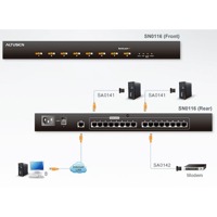 Der SN0116 ist ein serieller Konsolenserver der Altusen SN-Serie. In diesem Gerät werden modernste Technologien mit sicheren Kommunikationsmöglichkeiten auf Unternehmensebene vereint. Somit ermöglicht der 16 Port Konsolenserver den Zugriff auf entfernte, serielle Konsolen, Server und Netzwerkgeräte über Netzwerk oder direkt über einen Telnet-/SSH-Client oder einen Applet-Viewer. Verbinden Sie den SN0116 direkt mit einem Altusen Power Over the NET™-Gerät um die Stromversorgung elektronisch verwalten zu können. Somit können Sie über die CC2000-Verwaltungssoftware alle Geräte problemlos zentral von einer Konsole aus steuern. Dank modernster Technologie und benutzerfreundlichen Funktionen, helfen die Konsolenserver der SN-Baureihe bei der Optimierung der IT-Produktivität und können beliebig erweitert werden.