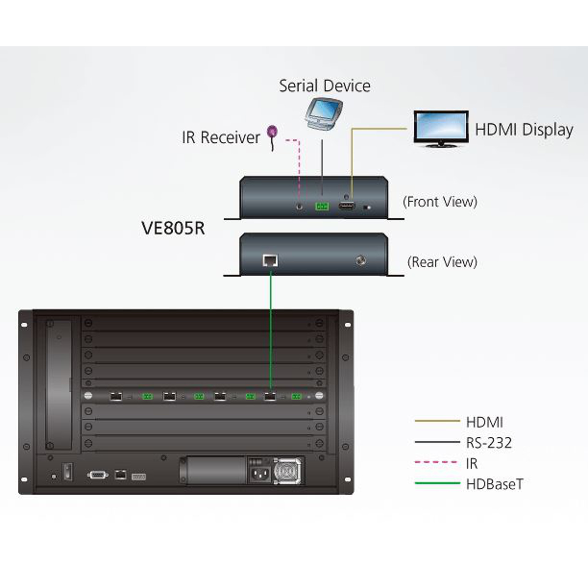 Die Skalierung von Anzeigen mit unterschiedlichen Grafikauflösungen wird dank dem integrierten Scaler des VE805R unterstützt. In Kombination mit der VM8514 HDBaseT Ausgabekarte von Aten unterstützt der VE805R Videowandintegration und Seamless Switch™ Funktionen™. Außerdem unterstützt der VE805R RS-232 und Infrarot Passthrough, womit Sie die Gegenstelle bequem über eine serielle oder IR Fernbedienung aus steuern können. Diese Übertragung erfolgt bidirektional, somit können Sie die Signale in beide Richtungen übertragen.