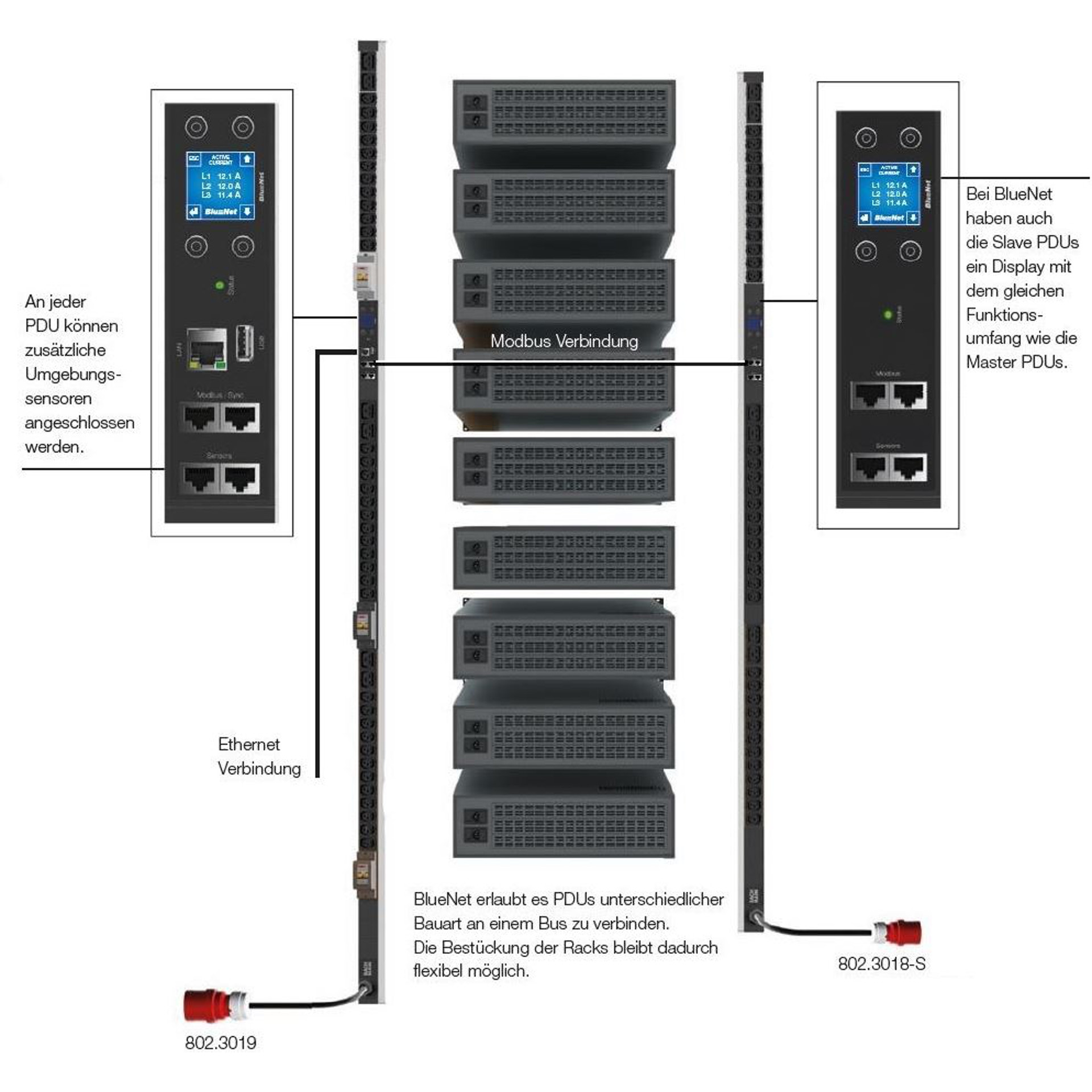 Die Geräte der BlueNet BN3000 Serie sind Steckdosenleisten mit optimiertem Formfaktor und integrierter Modbusschnittstelle, worüber sich die Geräte einfach kaskadieren Lassen. So können über einen Ethernet Port bis zu 10 Geräte überwacht werden. Das integrierte OLED Display lässt sich über die Software einfach drehen, so dass die Geräte horizontal oder vertikal angebracht werden können.