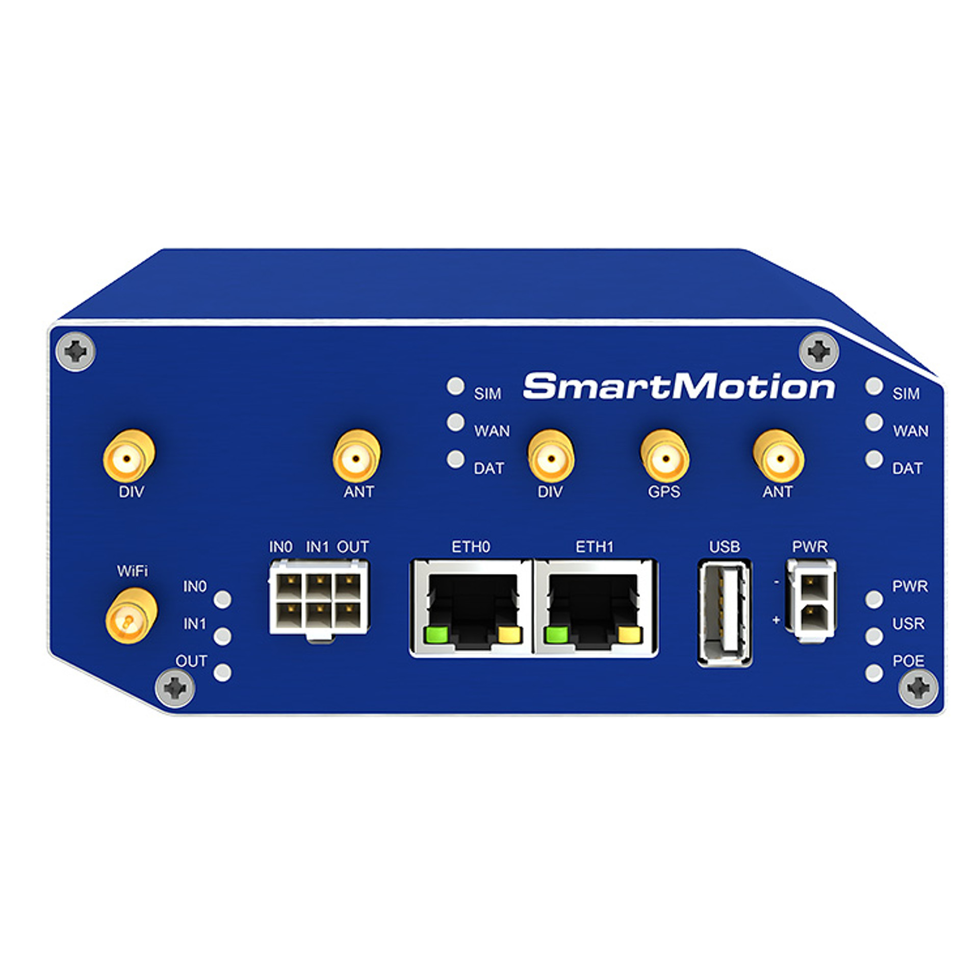 Das flexible SmartMotion™ Konzept umfasst 2 Ethernet Ports mit 2 voneinander unabhängigen LANs/IP-Adressen. Die Standardausführung umfasst ebenso 1 USB Host Port, 1 microSD-Kartenhalter, 4 SIM-Kartenhalter für die automatische Weiterleitung bei Ausfall eines Providers, 2 binäre Eingänge (I/O), 1 binären Ausgang (I/O) und integriertes GPS. Ein optional integriertes WiFi Modul, das den industriellen Anforderungen hinsichtlich des Betriebstemperaturbereichs von -40 bis 75 °C (-20 bis +60 °C LTE450 Modul) entspricht, ist ebenso verfügbar.
