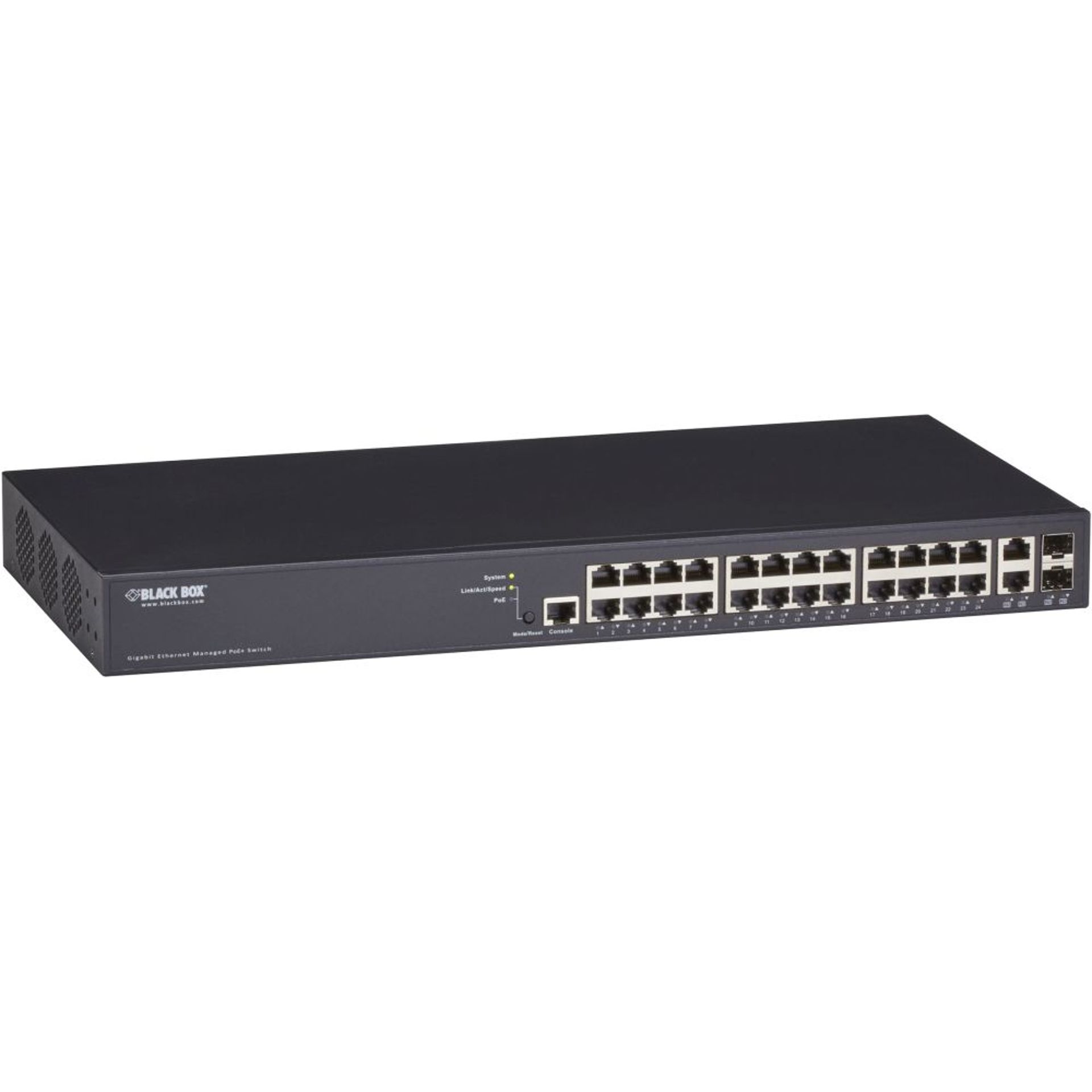 LPB2926A Gigabit Managed PoE+ Switch von Black Box mit 24x 10/100/1000 Mbps PoE+ und 2x 10/100/1000 Dual Media RJ45/SFP Anschlüssen