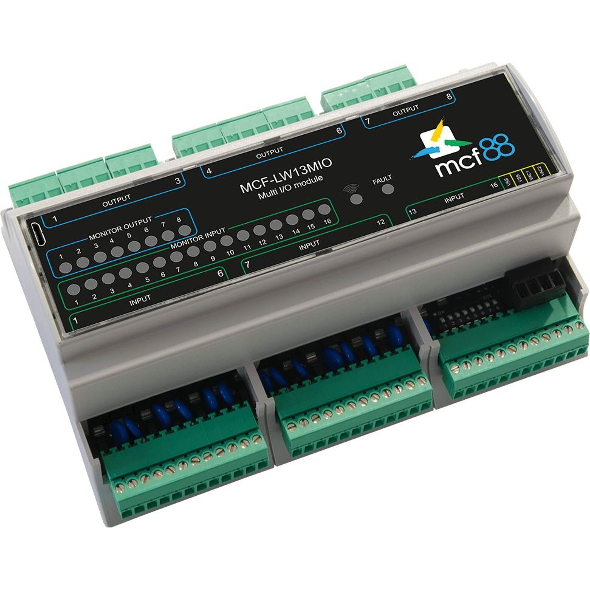 Der MCF-LW13MIO ist ein LoRaWAN Multi I/O Modul, das mit 16x optoisolierten Stromeingängen (5-24 VAC/VDC) und 8x Relaisausgängen mit COM, NO und NC Kontakten ausgestattet ist. Sämtliche Ein- und Ausgänge sind galvanisch isoliert und ein LoRaWAN Netzwerk wird verwendet, um den Zustand der Eingänge zu übertragen und die Ausgänge zu kontrollieren. Dieses LoRaWAN Multi I/O Modul verfügt über einen USB Anschluss für das Einrichten von IoT Nodes und die Aktualisierung der Firmware. Es kann mit bis zu 9 weiteren Modulen auf einer EN 60715 Hutschiene montiert werden und eignet sich für die Verwendung bei industrieller Prozesskontrolle, Home Automation, Wasseraufbereitung und ähnlichen Anwendungen.