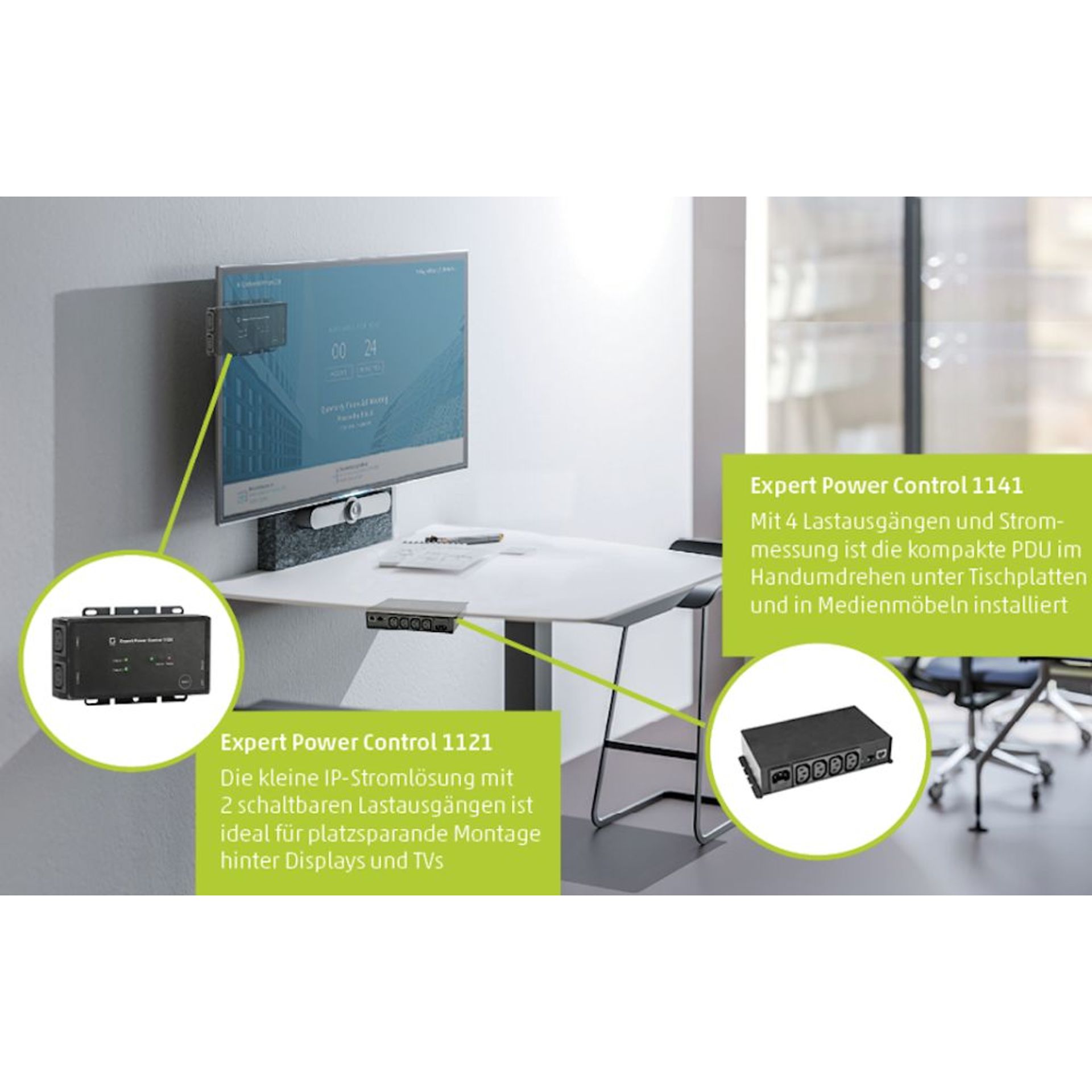 Die Expert Power Control 1121-1 ist eine 2-fach schaltbare IP PDU mit zwei IEC C13 Lastausgängen und einem IEC C14 Stromeingangs (max. 10A, 230V), der eine Messfunktion mit zwei integrierten Energiezählern bietet, welche es ermöglicht verschiedene Energiewerte (z.B. Spannung, Leistungsfaktor, Strom, usw.) zu erfassen. Ausgänge können über Modbus TCP, MQTT, HTTP(S), SSH, SNMP oder Telnet ein- und ausgeschaltet werden. Diese 2-fach schaltbare IP PDU bietet außerdem Überspannungsschutz und kann auch mit externen Gude Sensoren ausgestattet werden, um die Umgebungsüberwachung zu erleichtern. Sie erlaubt es dem Benutzer ebenfalls einen Abschalt-Zeitplan zu erstellen, um den Stromverbrauch zu verringern, und hat eine Watchdog-Funktion für den Automatischen Neustart bei Problemen. Die Expert Power Control 1121-1 eignet sich dank ihrem kompakten Design für die Montage hinter einem Bildschirm oder auf der Unterseite eines Tisches in UC (Unified Communication) Räumen, Testlaboren, Besprechungszimmern und Konferenzräumen. Sie können ebenfalls für Edge Computing oder Digital Signage Anwendungen verwendet werden.