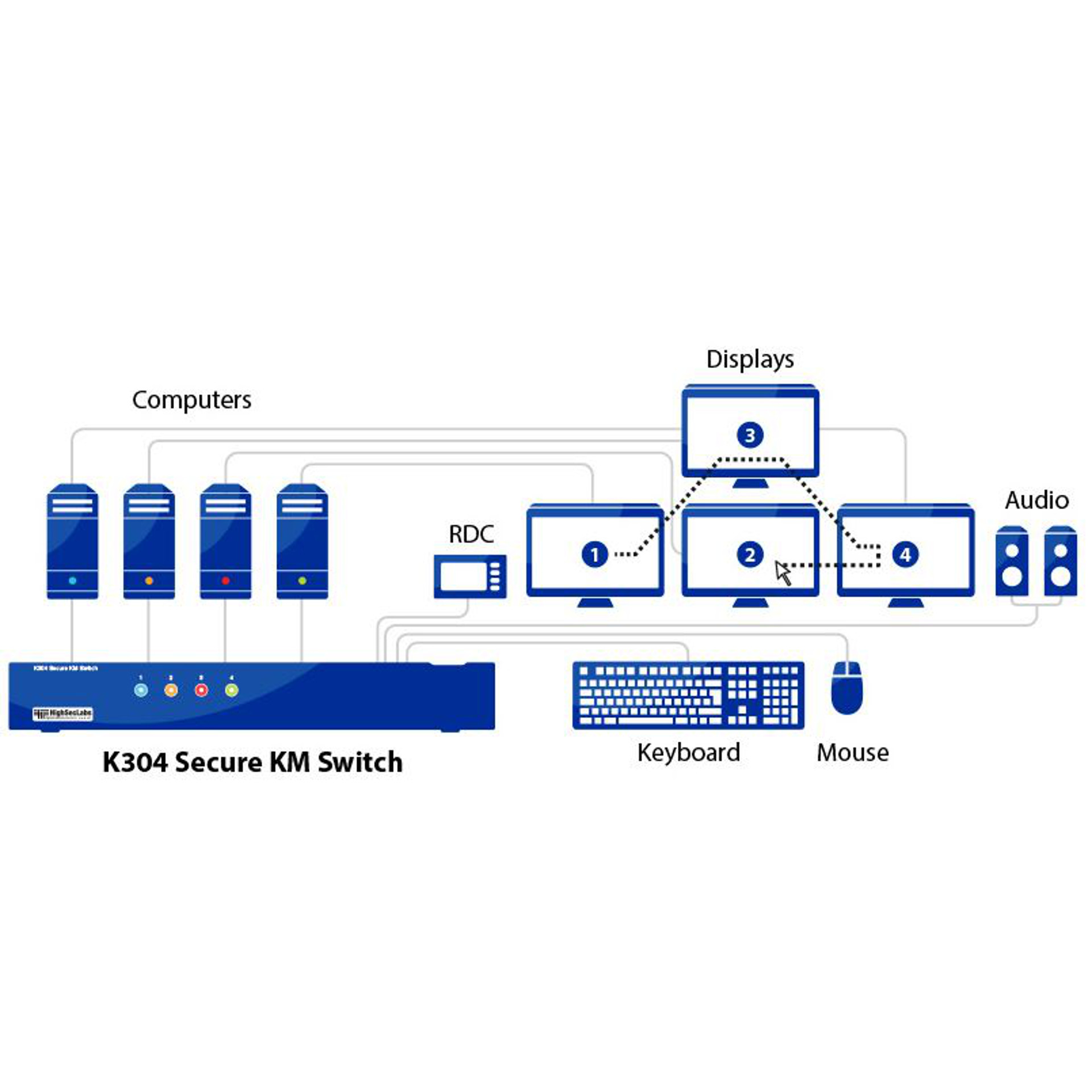 Der K304 gestattet die gemeinsame Benutzung eines einzigen Keyboard-, Maus- & Audiosets für vier Computer unterschiedlicher Sicherheitsstufe, während er alle Hosts und ebenso die Peripheriegeräte, die gemeinsam über ihn genutzt werden, voneinander isoliert und somit die Daten der jeweiligen Computer absolut getrennt hält.