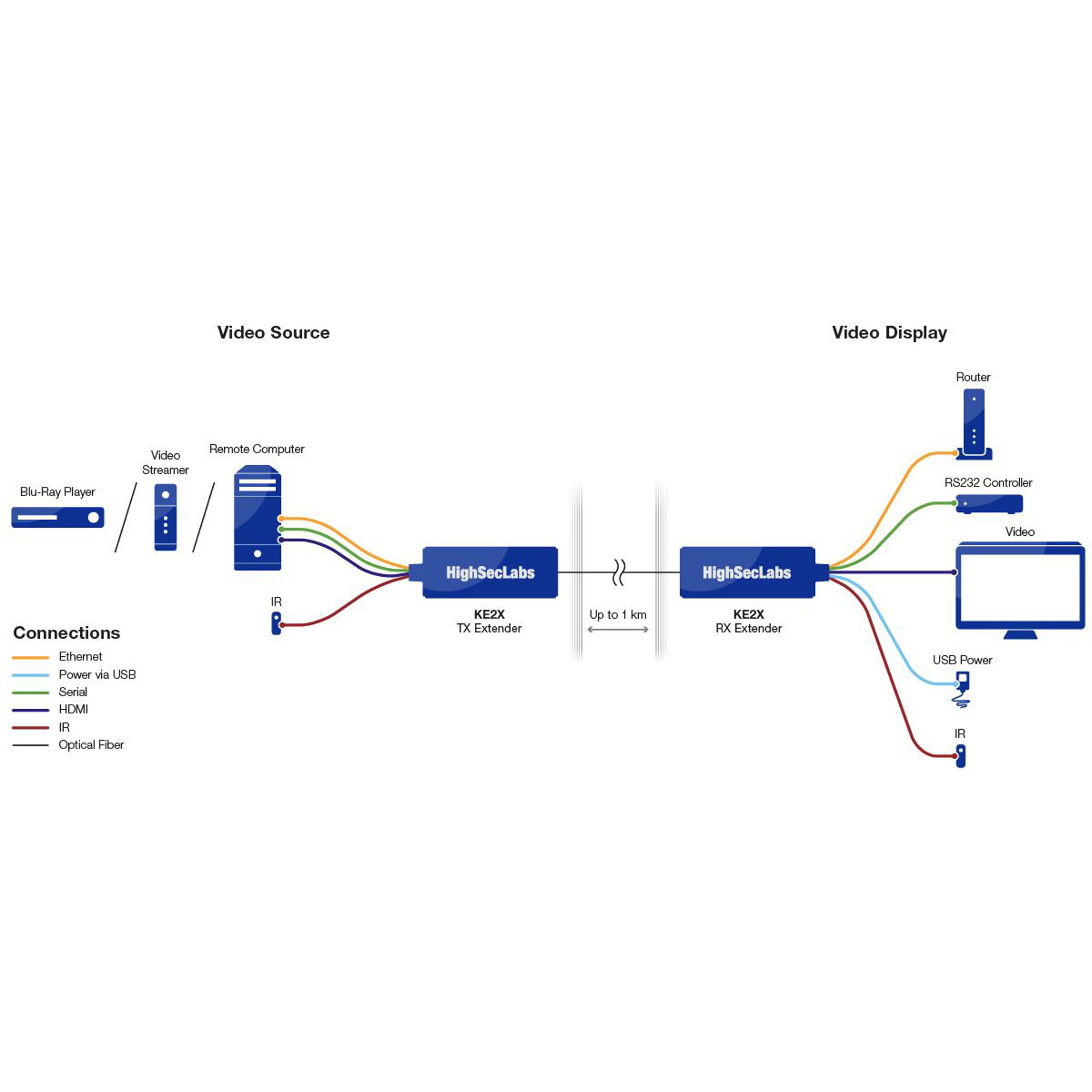 Der LAN-Port der Extender ist voll mit IEEE 802.3-2005 und 10BASE-T/100BASE-T kompatibel, um TCP-basierte Geräte auf bis zu einen Kilometer zu verlängern. Sowohl die KE1X und die KE2X verlängern sowohl IR-Datenverkehr zur Fernsteuerung als auch serielle RS232-Kommunikation via USB auf der TX-Seite.