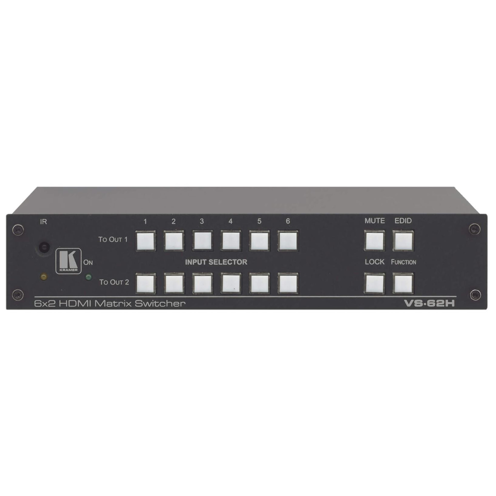 VS-62H von Kramer Electronics ist eine automatische HDMI (4:2:0) Videomatrix für 4k60 Auflösungen mit 6 Eingängen auf 2 Ausgänge. Die Umschaltung der Ein- und Ausgänge funktioniert automatisch (zuletzt verbunden oder mit Priotirät), über Step-In Funktion oder manuell via Fronttasten, Infrarot Fernbedienung, RS232, Ethernet oder Kontaktschluss.