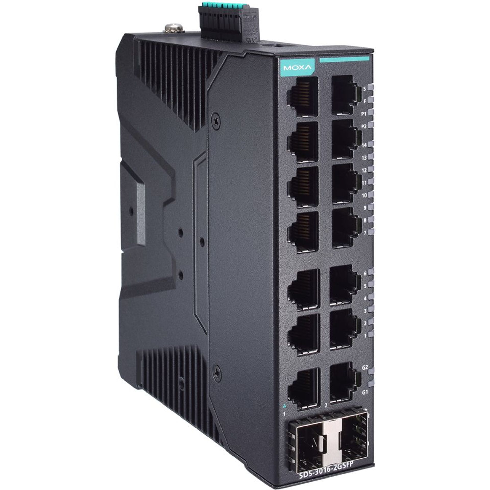 Die SDS-3016 Serie umfasst mehrere Gigabit Smart Ethernet Switches von Moxa mit 14x 10/100 Mbps und 2x 10/100/1000 Mbps Anschlüssen, welche die EtherNet/IP, PROFINET und Modbus TCP Protokolle unterstützen. Sie beinhaltet Modelle mit Gigabit Ethernet oder Gigabit SFP Ports.
