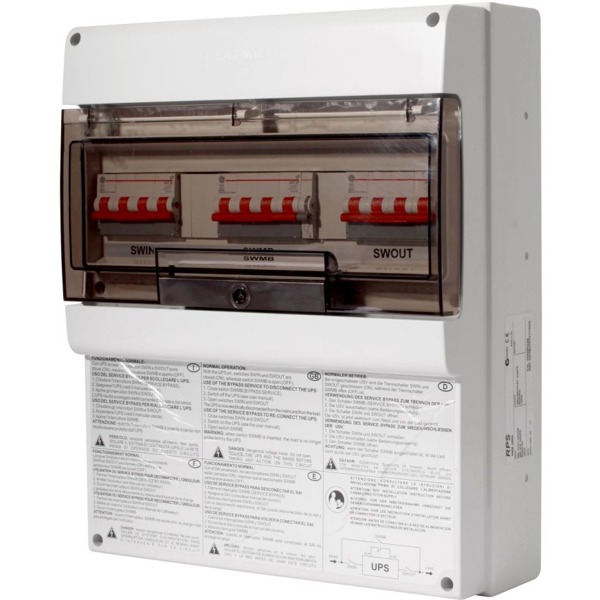 Erhältlich nur für einphasige USV Anlage 10 bis 20 kVA und dreiphasige USV-Anlagen10 bis 40 kVA. Dieser Bypass beinhaltet drei Schalter, wie in der nebenstehenden Zeichnung dargestellt, um die USV-Anlage für Wartungen oder Reparaturen vollständig spannungsfrei schalten zu können. Der Schalter SWMB hat zusätzliche Hilfskontakte zur Signalisierung der Schalterstellung an die USV-Anlage zur Vermeidung einer Rückspeisung.
