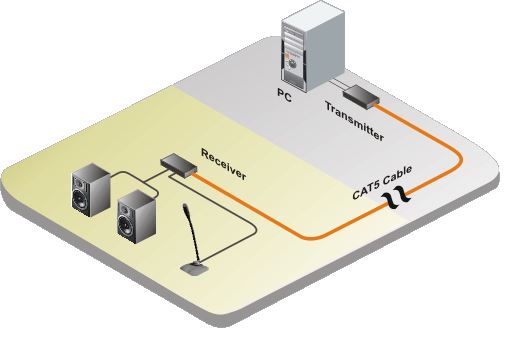 - Verlängern Sie Stereo-Audio und ein Mikrofon bis zu 1.000 Fuß (300m) über ein einziges CAT5-Kabel