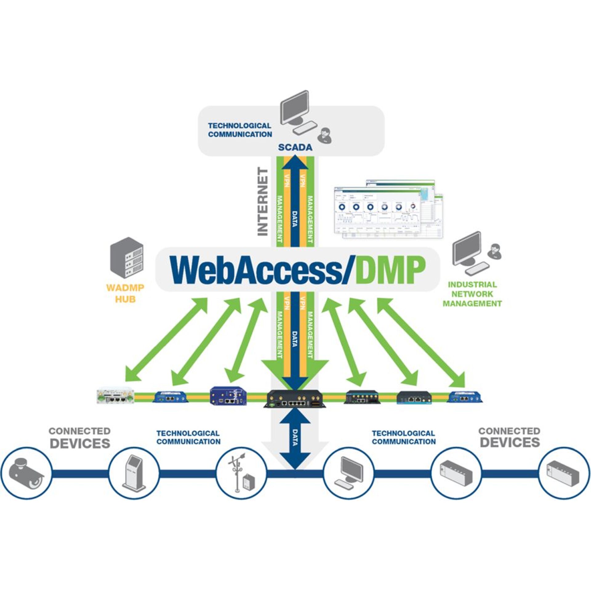 WebAccess/DMP V3 ist eine leistungsstarke Router Netzwerk Management Software, die es ermöglicht mehrere Router von einem zentralen Standort zu verwalten. Sie bietet mehrere anpassbare Dashboards, die insbesondere die Konfiguration und Überwachung der Geräte vereinfachen. Um die Sicherheit der Daten zu verbessern verwendet diese Software nicht nur 2-Faktor Authentifizierung, sondern auch PKI Verschlüsselung und WireGuard VPN. Dank des neuen VPN Management Feature kann die Konfiguration der VPN Einstellungen ebenfalls automatisiert werden, weshalb kein manuelles Setup mehr notwendig ist. Diese Router Management Plattform unterstützt außerdem Zero-Touch Provisioning und ermöglicht es mehrere Router zu Gruppieren, um diese gemeinsam konfigurieren zu können. WebAccess/DMP ist nicht nur mit den v1 (ICR-16xx, ICR17xx), v2i (ICR-2xxx), v3 (ICR-3xxx), v4 (ICR-44xx) und V4i (ICR-41xx, ICR-42xx) ICR Routern, sondern auch mit den SmartStart und SmartFlex Geräten kompatibel.