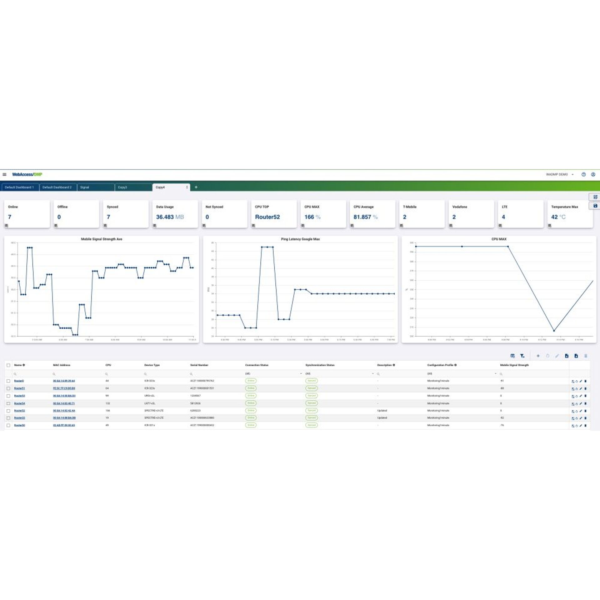 Jeder Benutzer kann neue Dashboards erstellen und diese beliebig anpassen. Es sind viele Designs vorhanden, die es erleichtern wichtige Informationen übersichtlich darzustellen. Für Router mit GPS Modulen ist eine Karte verfügbar auf der die Standorte angezeigt werden.