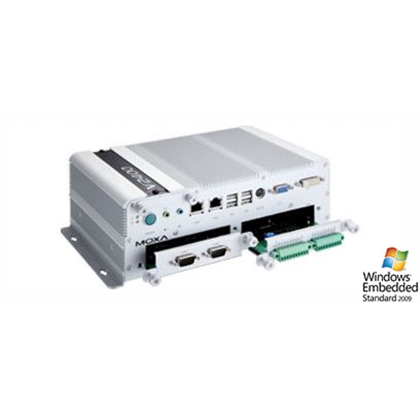 Der V2422 von Moxa ist ein industrieller Computer mit lüfterloser Bauweise, Intel Atom N270 1.6 GHz Prozessor, Windows Embedded Standard 2009 Betriebssystem, 1 GB RAM (max. 2 GB), dual Displays (VGA + DVI-I), 2 Gigabit-Ethernet Ports, jeweils 4 digitale Ein- & Ausgänge, 6 USB Anschlüsse, CompactFlash, einen SATA-150 Anschluss und 2 periphere Erweiterungsslots.