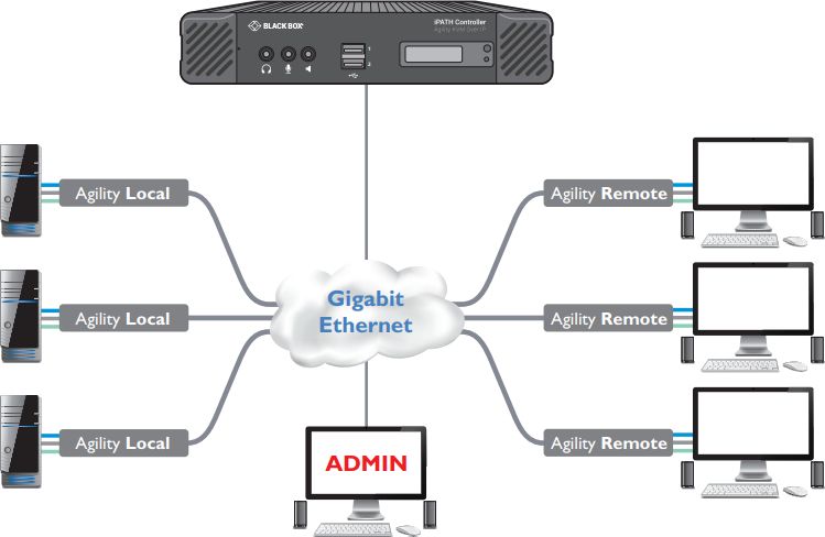 Der iPATH Agility Controller ist eine KVM over IP Management Lösung für die Verwaltung und Steuerung von mehreren Transmittern und Receivern der Agility Produktreihe von Black Box, die abhängig von der Version, mit einer beliebigen Anzahl an Endpunkten verbunden werden kann. Sie ermöglicht es umfangreiche Matrix Systeme zu erstellen und erlaubt es dem Admin die Zugangsrechte der Benutzer zu bestimmen. Die Konfiguration und die Bedienung dieser KVM over IP Management Lösung erfolgt über die intuitive Weboberfläche. Sie unterstützt sowohl HD Video, Audio, USB als auch serielle Signale und erlaubt es jederzeit weitere Agility Geräte in das System zu integrieren. Der iPATH Agility Controller verwendet ein Standard-Ethernet-Protokoll (Managed IP Switch) für den Betrieb, weshalb er keinen proprietäre Technologie für die Umschaltung benötigt und bietet einen eigenen DHCP-Server. Mehrere Benutzer und Geräten können in Gruppen aufgeteilt werden, um den Zeitaufwand der Administratoren zu verringern. Diese KVM over IP Management Lösung kann Signale von verschiedenen Quellen kombinieren und mit einem LDAP/Active Directorey-Server synchronisiert werden, um Benutzerdaten von vorhandenen Datenbanken zu erhalten.