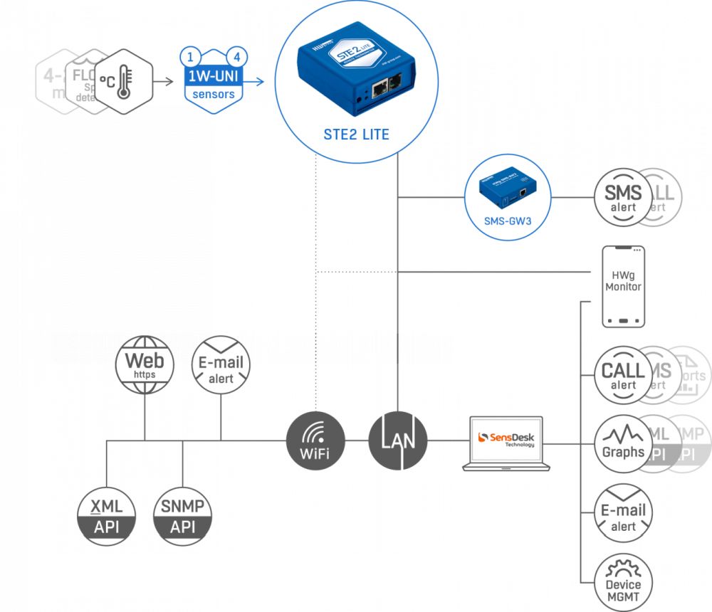 Die STE2 LITE ist eine kompakte Monitoring Lösung für die Überwachung von Serverräumen, Lagerhallen, Rechenzentren, Kühlräumen und desgleichen, welche die Messungen von bis zu 4x 1-Wire Sensoren über den RJ11 Anschluss empfangen kann und die gesammelten Daten entweder über Ethernet LAN oder WiFi übertragt. Für den Einsatz von mehrere RJ11 Sensoren muss eine Daisy Chain erstellt werden. Sobald einer der Werte (z.B. Temperatur, CO2 Konzentration oder Luftfeuchtigkeit) die definierten Limits überschreiten, wird eine Alarmierung über SMS, E-Mail, HWg-Push oder ein Online Portal (z.B. SensDesk.at) gesendet, um Schäden oder sonstige Probleme zu verhindern. Die STE2 LITE unterstützt außerdem M2M Open API und wird sowohl mit einem Temp-1Wire 1m Temperatursensor als auch einem 5V Netzteil geliefert.